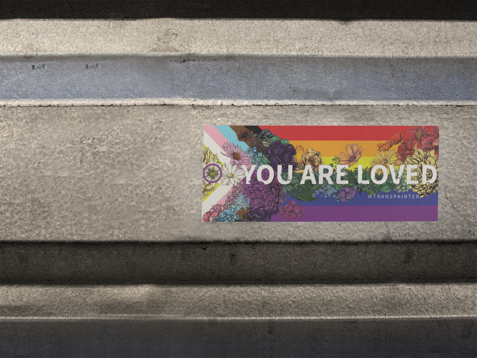 3x9 art bumper sticker by @transpainter stickers that read "You Are Loved” in white lettering over a rainbow floral background inspired by the colors of the LGBTQ+ progress pride flag. Each sticker is printed on a thick, durable vinyl with a matte finish-giving your stickers a premium look & feel. They are designed for indoor and outdoor use. Art copyright Rae Senarighi (Transpainter)