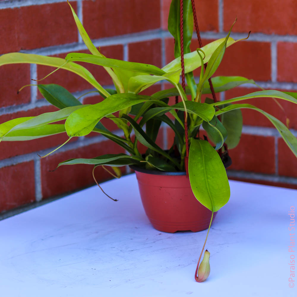 Nepenthes carnivorous pitcher plant in a 6in plastic hanging pot. Needs very bright light indoors.