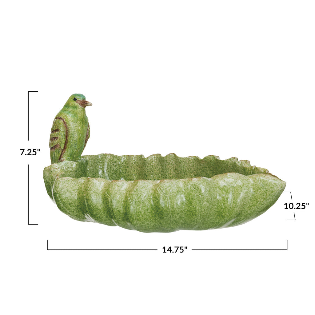 This resin leaf shaped dish is a lovely way to bring some of the outdoors into the home. The dish has a green color and a leaf shape with a scalloped edge that mimics the natural curves of a real leaf. A small bird sits on the edge of the dish, adding a playful and charming touch. The dish is made of resin, which is a sturdy and lightweight material that can withstand wear and tear. The dish measures 14.75 inches in length, 10.25 inches in width, and 7.25 inches in height.