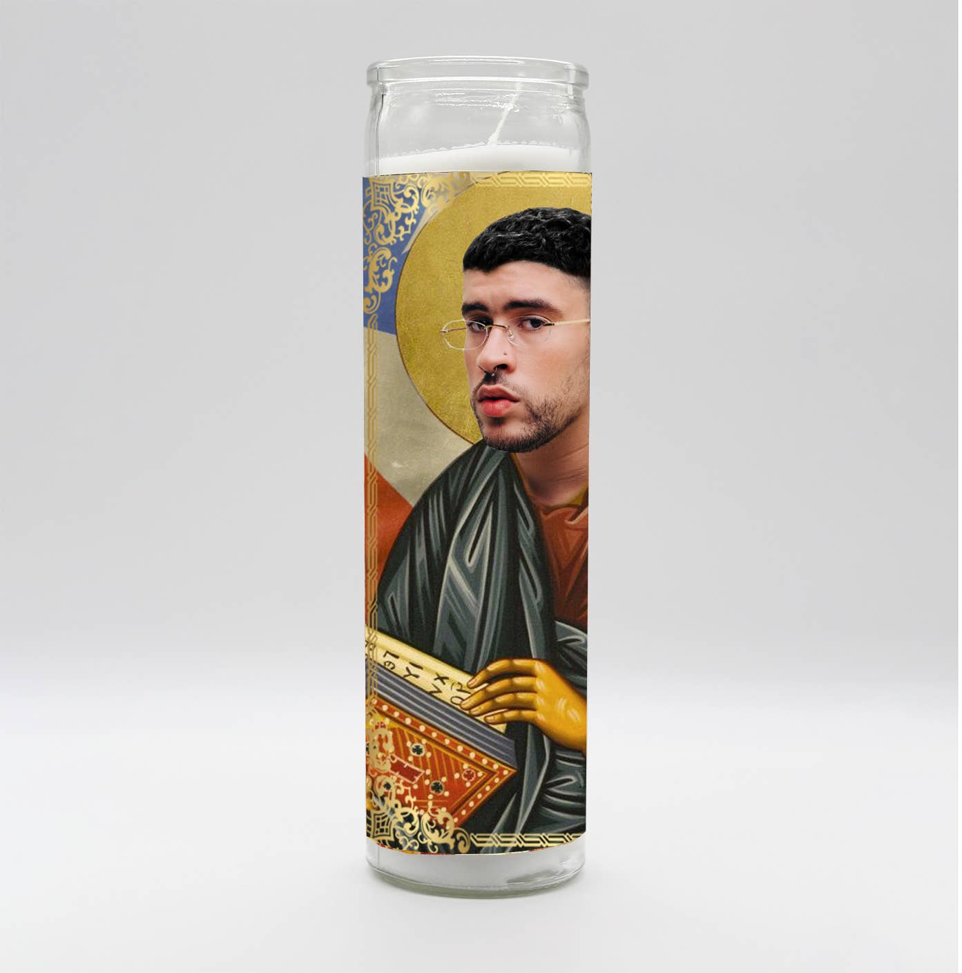 Tall white candle, hand poured in Mexico, design and assembled in the USA. Candle is unscented. Bad Bunny inspired parody art prayer candle.