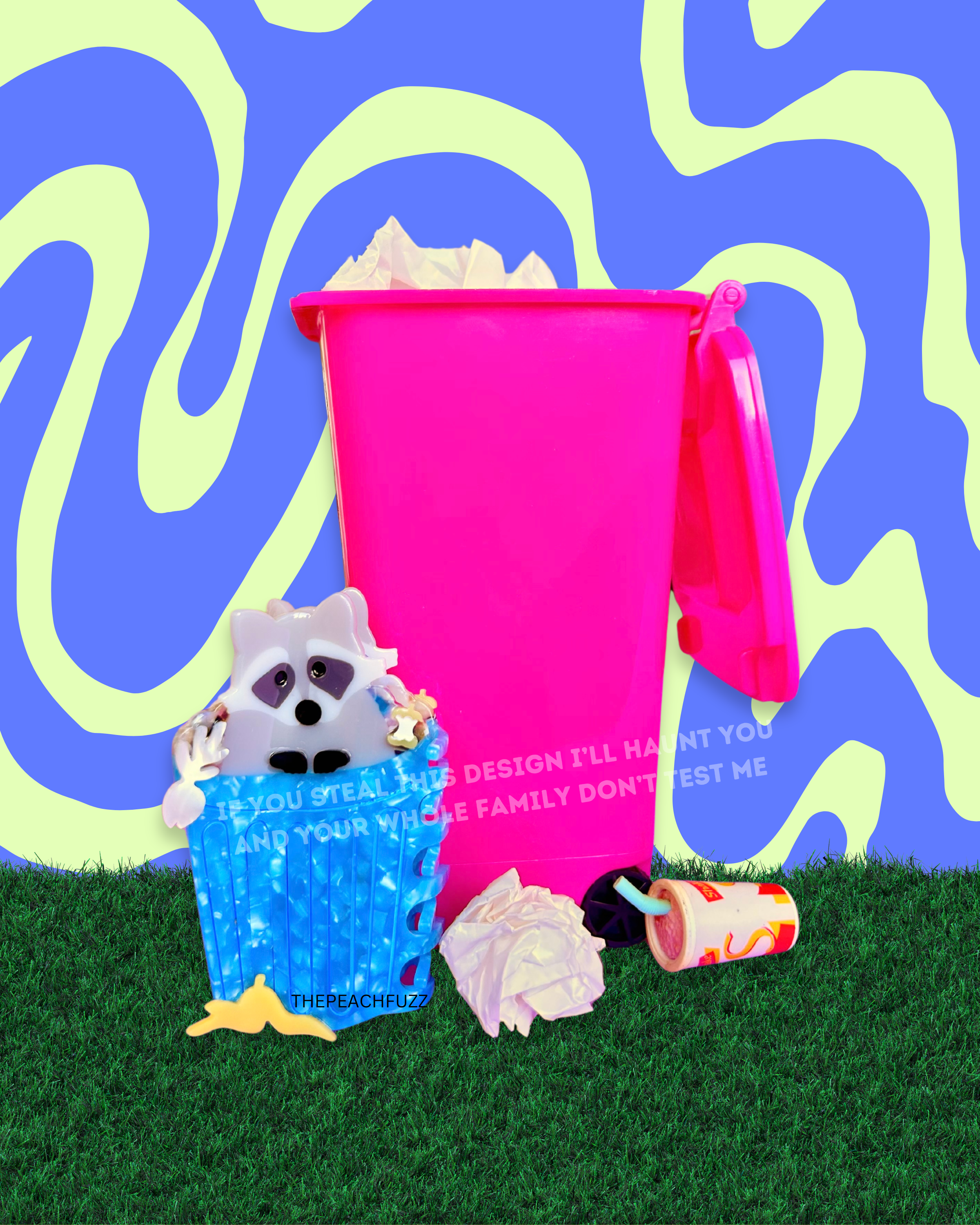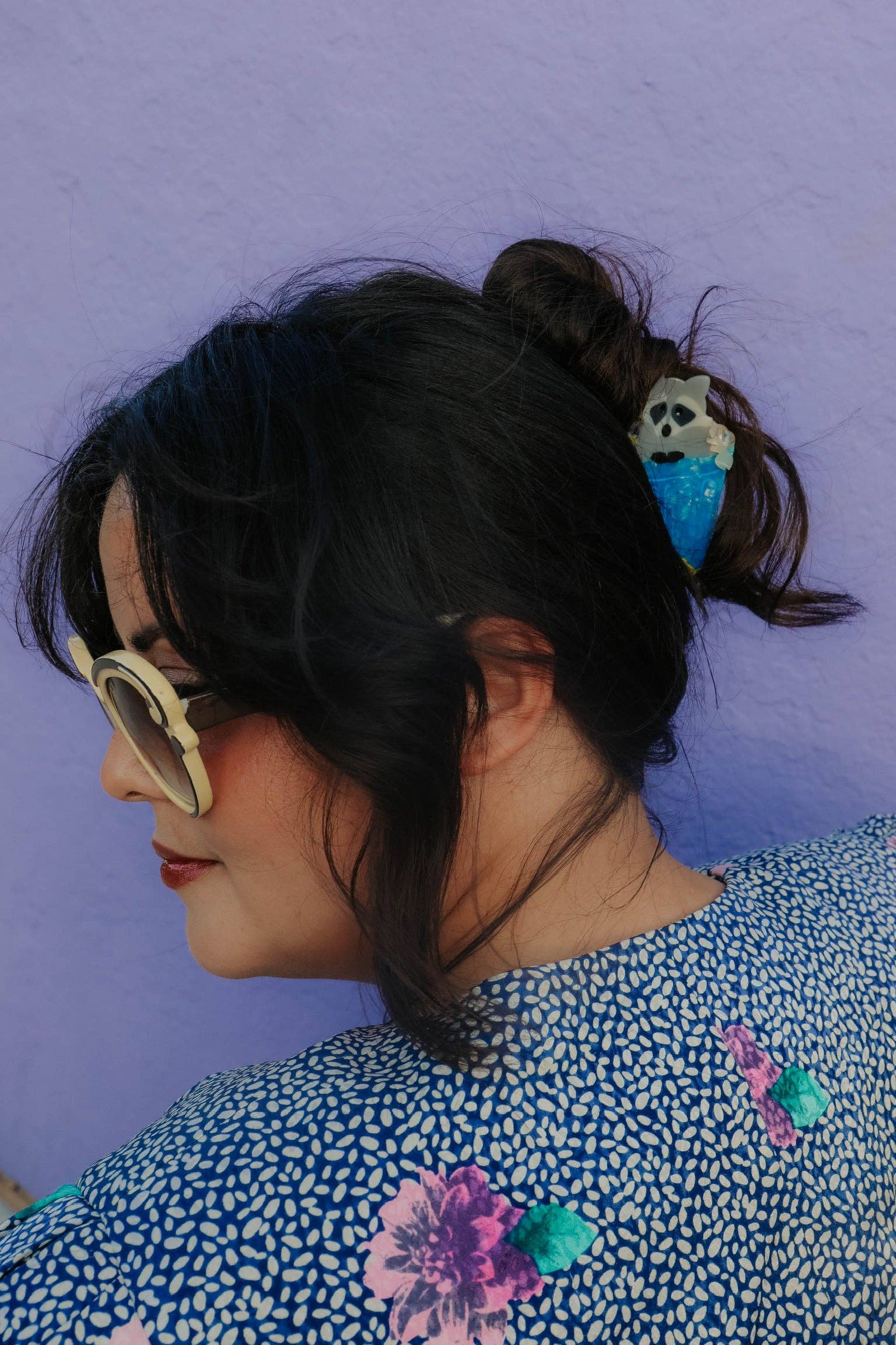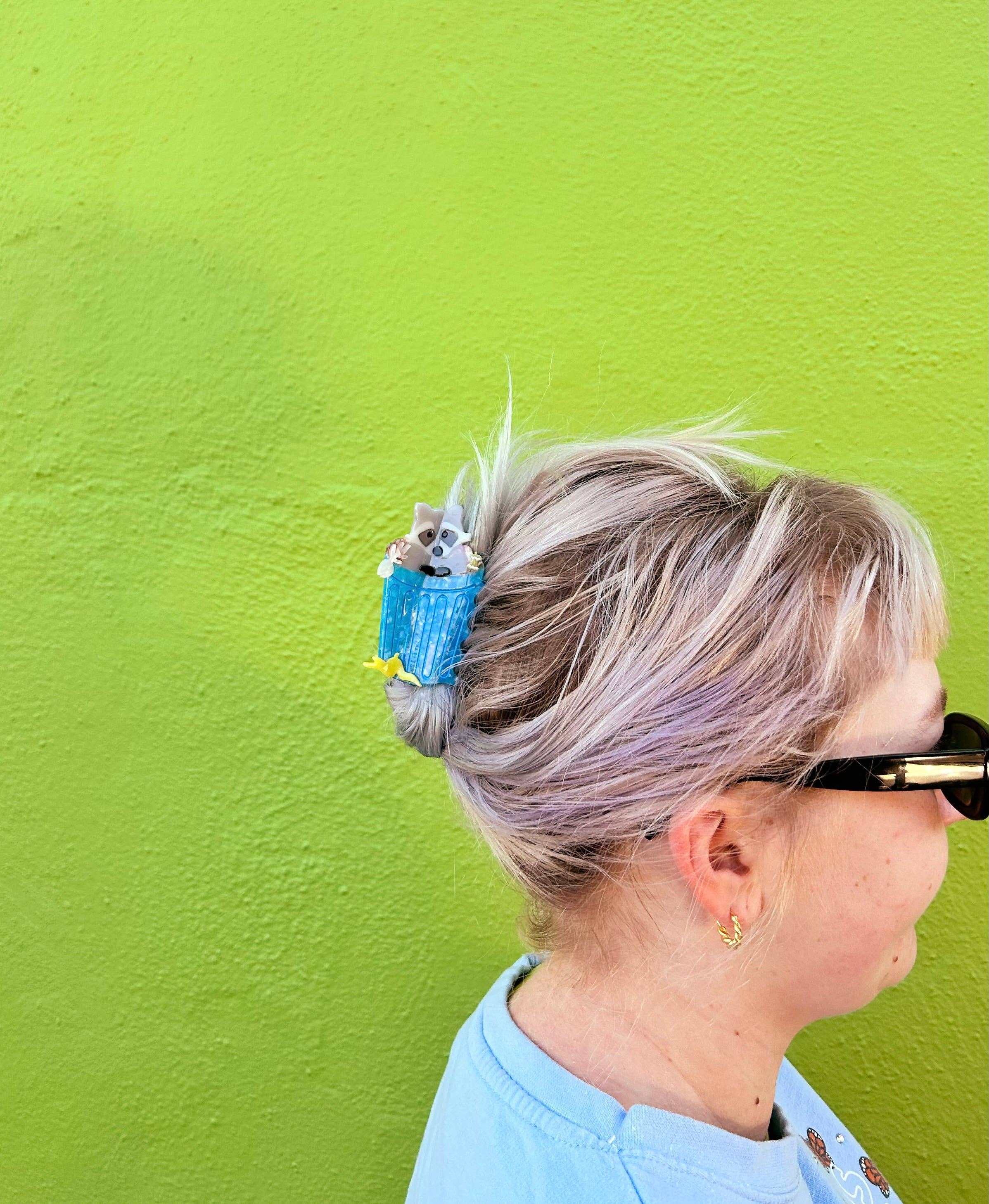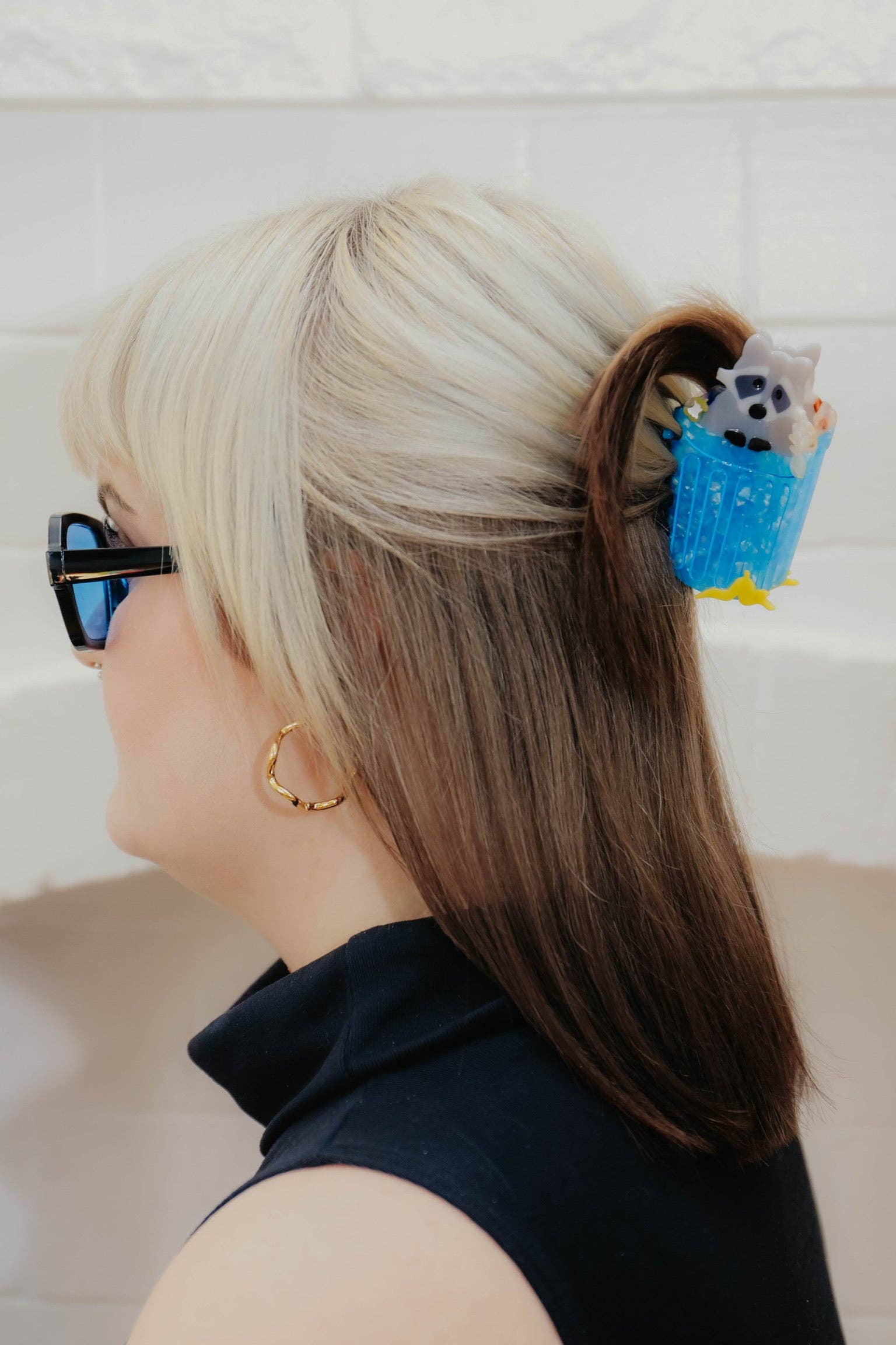 I'M THE TRASH MAN! And every trash man deserves their own trash panda. This raccoon inspired hair claw comes complete with a little guy in his cozy trash can and all his favorite scraps. Made of eco-friendly cellulose acetate (made from plants!) Measures 3.25 inches long. Designed by me in San Francisco, CA. **Imperfect hair claws have little bits of the fish or banana broken. Still fully functional! 10% of all sales goes directly to supporting community organizations.